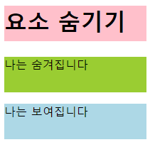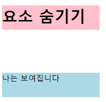 - 요소 숨기기 : 요소가 웹 브라우저에서 보이지 않게 하는 것