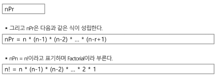 - 서로 다른 n개 중 r개를 택하는 순열은 아래와 같이 표현한다.