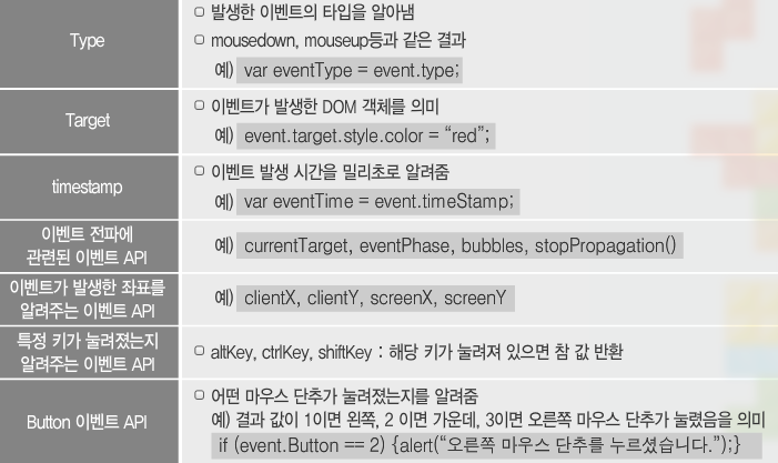 - 전달 받은 이벤트 객체는 이벤트 API를 이용하여 각종 이벤트 정보를 구함