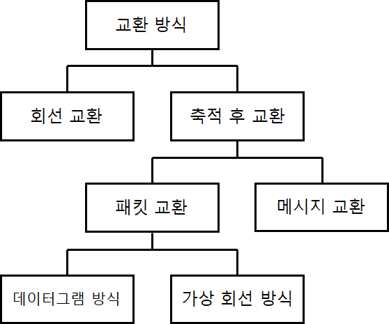 - 네트워크에서의 데이터 교환 방식은 대표적으로 회선 교환 방식(Circuit Switching)과 패킷 교환 방식(Packet Switching)을 사용