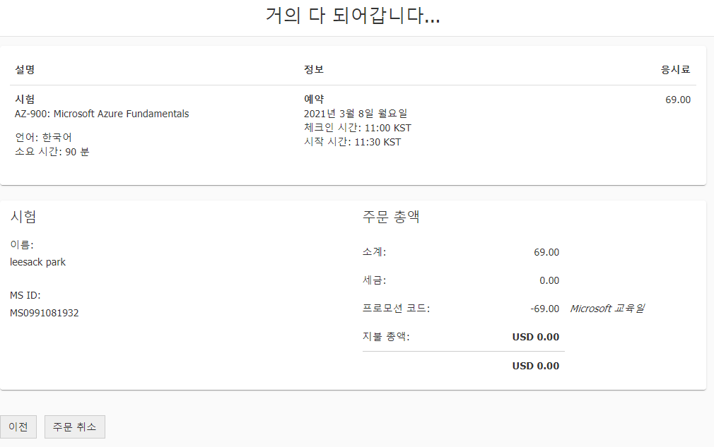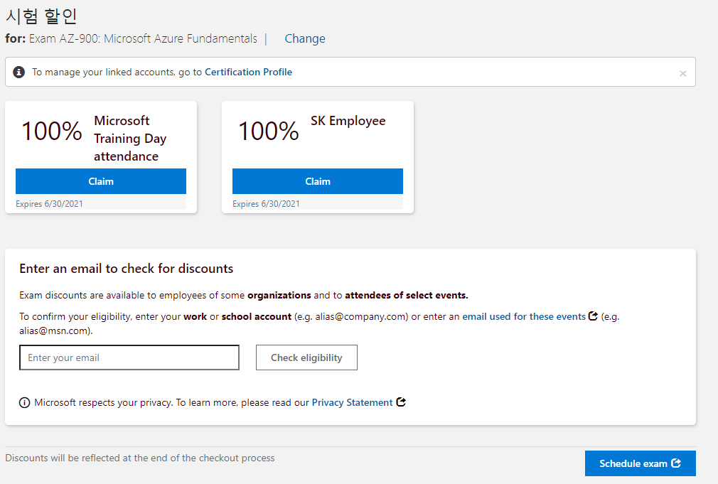 나의 경우 Microsoft Training Day attendance를 수강했을 때 받은 무료 바우처와
