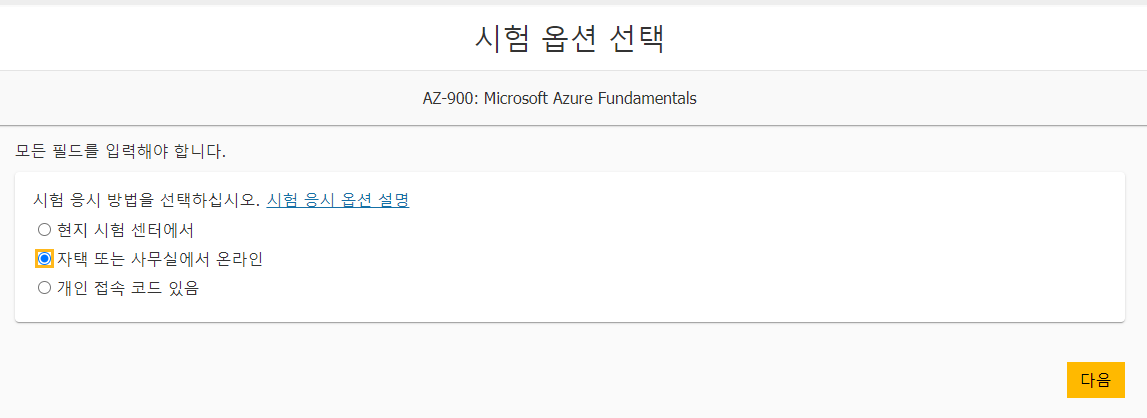 시험 옵션을 선택하는 란이 나오는데, 나는 집에서 온라인으로 응시했다.