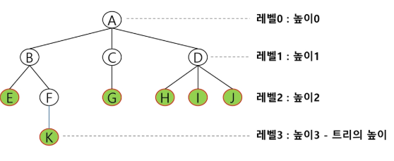 - 자손 노드 - 서브 트리에 있는 하위 레벨의 노드들 -B의 자손 노드 -E,F,K