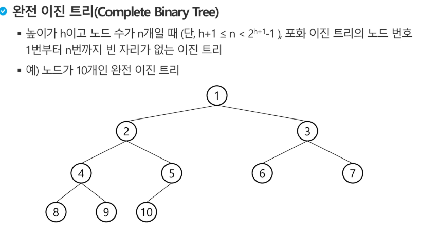 - 높이가 h이고 노드수가 n개일 때 포화 이진트리의 노드번호 1번부터 n번까지 빈 자리가 없는 이진 트리
